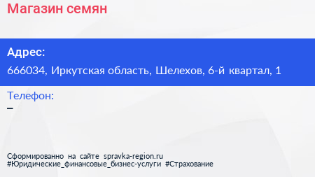 Магазин семян по адресу 666034, Иркутская область, Шелехов, 6-й квартал, 1 в дальнейшем Организация, размещена в следующих категориях: