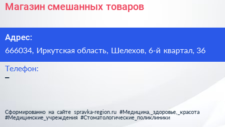 Магазин смешанных товаров по адресу 666034, Иркутская область, Шелехов, 6-й квартал, 36 в дальнейшем Организация, размещена в следующих категориях: