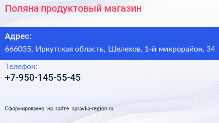 Поляна, продуктовый магазин по адресу 666035, Иркутская область, Шелехов, 1-й микрорайон, 34 в дальнейшем Организация, размещена в следующих категориях: