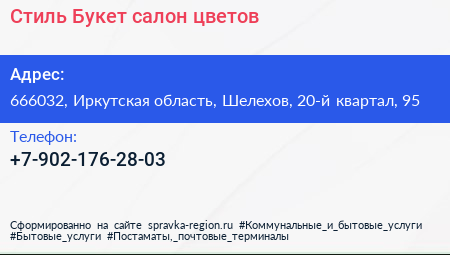 Стиль Букет, салон цветов по адресу 666032, Иркутская область, Шелехов, 20-й квартал, 95 в дальнейшем Организация, размещена в следующих категориях:
