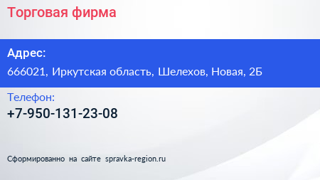 Торговая фирма по адресу 666021, Иркутская область, Шелехов, Новая, 2Б в дальнейшем Организация, размещена в следующих категориях: