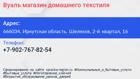 Вуаль, магазин домашнего текстиля по адресу 666034, Иркутская область, Шелехов, 2-й квартал, 16 в дальнейшем Организация, размещена в следующих категориях: