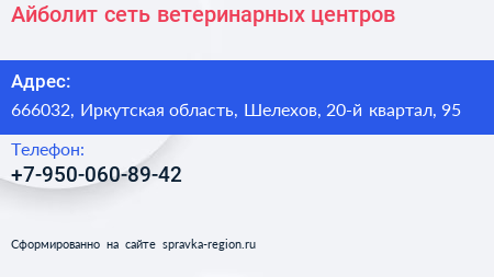 Айболит, сеть ветеринарных центров по адресу 666032, Иркутская область, Шелехов, 20-й квартал, 95 в дальнейшем Организация, размещена в следующих категориях: