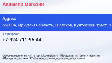 Аквамир, магазин по адресу 666034, Иркутская область, Шелехов, Култукский тракт, 17 в дальнейшем Организация, размещена в следующих категориях: