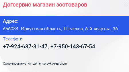 Догсервис, магазин зоотоваров по адресу 666034, Иркутская область, Шелехов, 6-й квартал, 36 в дальнейшем Организация, размещена в следующих категориях: