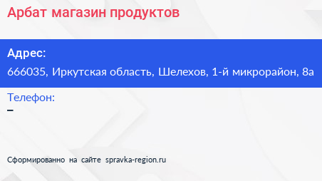 Арбат, магазин продуктов по адресу 666035, Иркутская область, Шелехов, 1-й микрорайон, 8а в дальнейшем Организация, размещена в следующих категориях: