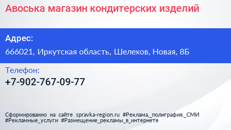 Авоська, магазин кондитерских изделий по адресу 666021, Иркутская область, Шелехов, Новая, 8Б в дальнейшем Организация, размещена в следующих категориях:
