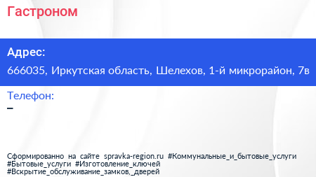 Гастроном по адресу 666035, Иркутская область, Шелехов, 1-й микрорайон, 7в в дальнейшем Организация, размещена в следующих категориях: