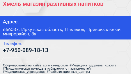 Хмель, магазин разливных напитков по адресу 666037, Иркутская область, Шелехов, Привокзальный микрорайон, 8а в дальнейшем Организация, размещена в следующих категориях: