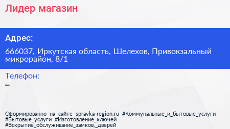 Лидер, магазин по адресу 666037, Иркутская область, Шелехов, Привокзальный микрорайон, 8/1 в дальнейшем Организация, размещена в следующих категориях: