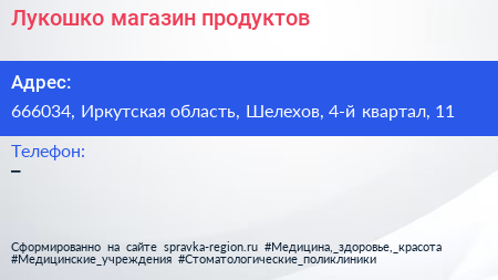 Лукошко, магазин продуктов по адресу 666034, Иркутская область, Шелехов, 4-й квартал, 11 в дальнейшем Организация, размещена в следующих категориях: