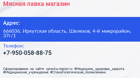Мясная лавка, магазин по адресу 666036, Иркутская область, Шелехов, 4-й микрорайон, 37г/1 в дальнейшем Организация, размещена в следующих категориях: