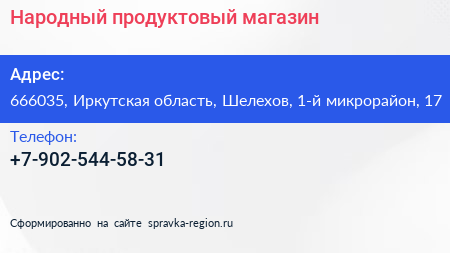 Народный, продуктовый магазин по адресу 666035, Иркутская область, Шелехов, 1-й микрорайон, 17 в дальнейшем Организация, размещена в следующих категориях: