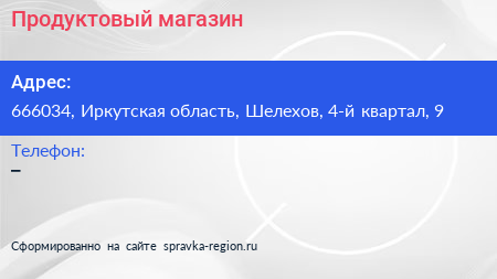 Продуктовый магазин по адресу 666034, Иркутская область, Шелехов, 4-й квартал, 9 в дальнейшем Организация, размещена в следующих категориях:
