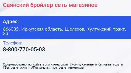 Саянский бройлер, сеть магазинов по адресу 666035, Иркутская область, Шелехов, Култукский тракт, 23 в дальнейшем Организация, размещена в следующих категориях: