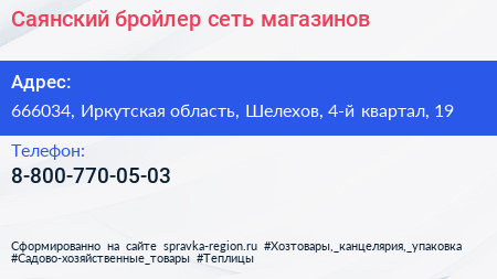 Саянский бройлер, сеть магазинов по адресу 666034, Иркутская область, Шелехов, 4-й квартал, 19 в дальнейшем Организация, размещена в следующих категориях: