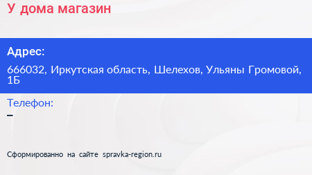 У дома, магазин по адресу 666032, Иркутская область, Шелехов, Ульяны Громовой, 1Б в дальнейшем Организация, размещена в следующих категориях: