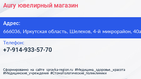 Aury, ювелирный магазин по адресу 666036, Иркутская область, Шелехов, 4-й микрорайон, 40а в дальнейшем Организация, размещена в следующих категориях:
