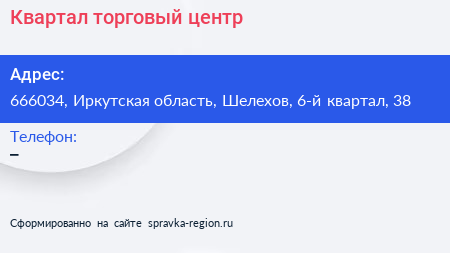 Квартал, торговый центр по адресу 666034, Иркутская область, Шелехов, 6-й квартал, 38 в дальнейшем Организация, размещена в следующих категориях: