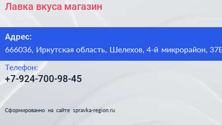 Лавка вкуса, магазин по адресу 666036, Иркутская область, Шелехов, 4-й микрорайон, 37Б в дальнейшем Организация, размещена в следующих категориях: