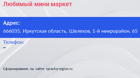 Любимый, мини-маркет по адресу 666035, Иркутская область, Шелехов, 1-й микрорайон, 65 в дальнейшем Организация, размещена в следующих категориях: