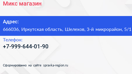 Микс, магазин по адресу 666036, Иркутская область, Шелехов, 3-й микрорайон, 5/1 в дальнейшем Организация, размещена в следующих категориях: