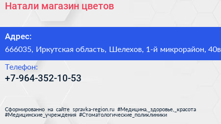 Натали, магазин цветов по адресу 666035, Иркутская область, Шелехов, 1-й микрорайон, 40в в дальнейшем Организация, размещена в следующих категориях: