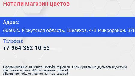 Натали, магазин цветов по адресу 666036, Иркутская область, Шелехов, 4-й микрорайон, 37Б в дальнейшем Организация, размещена в следующих категориях: