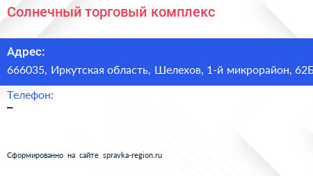Солнечный, торговый комплекс по адресу 666035, Иркутская область, Шелехов, 1-й микрорайон, 62Б в дальнейшем Организация, размещена в следующих категориях: