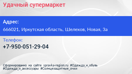 Удачный, супермаркет по адресу 666021, Иркутская область, Шелехов, Новая, 3а в дальнейшем Организация, размещена в следующих категориях: