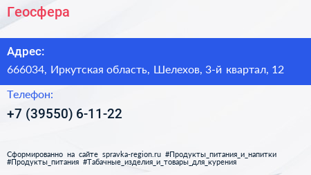 Геосфера+ по адресу 666034, Иркутская область, Шелехов, 3-й квартал, 12 в дальнейшем Организация, размещена в следующих категориях: