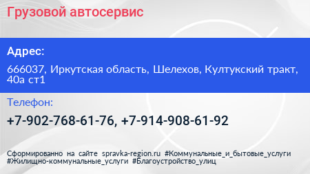 Грузовой автосервис по адресу 666037, Иркутская область, Шелехов, Култукский тракт, 40а ст1 в дальнейшем Организация, размещена в следующих категориях: