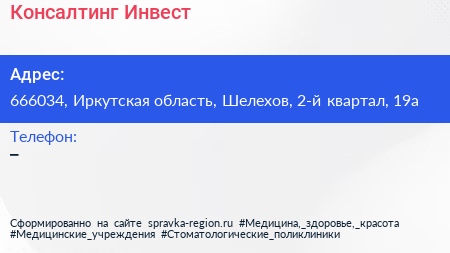 Консалтинг-Инвест по адресу 666034, Иркутская область, Шелехов, 2-й квартал, 19а в дальнейшем Организация, размещена в следующих категориях: