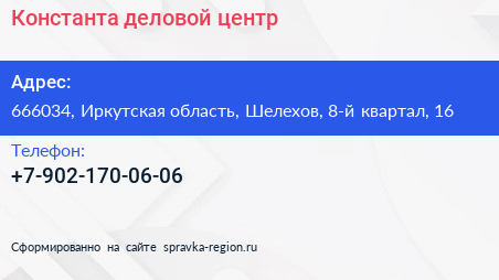 Константа, деловой центр по адресу 666034, Иркутская область, Шелехов, 8-й квартал, 16 в дальнейшем Организация, размещена в следующих категориях: