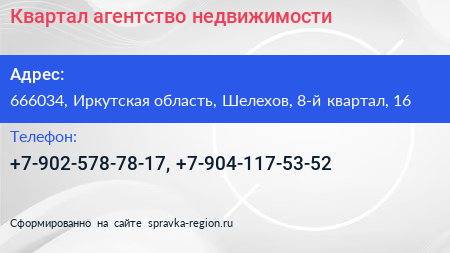 Квартал, агентство недвижимости по адресу 666034, Иркутская область, Шелехов, 8-й квартал, 16 в дальнейшем Организация, размещена в следующих категориях: