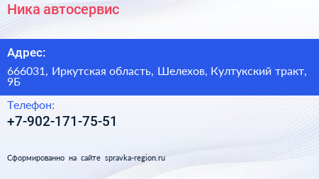 Ника, автосервис по адресу 666031, Иркутская область, Шелехов, Култукский тракт, 9Б в дальнейшем Организация, размещена в следующих категориях: