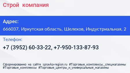 Строй+, компания по адресу 666037, Иркутская область, Шелехов, Индустриальная, 2 в дальнейшем Организация, размещена в следующих категориях: