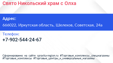 Свято-Никольский храм, с. Олха по адресу 666022, Иркутская область, Шелехов, Советская, 24а в дальнейшем Организация, размещена в следующих категориях: