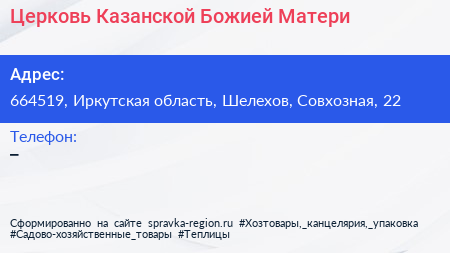 Церковь Казанской Божией Матери по адресу 664519, Иркутская область, Шелехов, Совхозная, 22 в дальнейшем Организация, размещена в следующих категориях:
