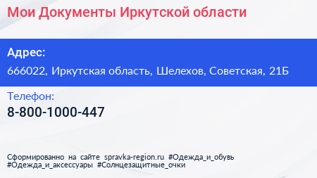 Мои Документы Иркутской области по адресу 666022, Иркутская область, Шелехов, Советская, 21Б в дальнейшем Организация, размещена в следующих категориях: