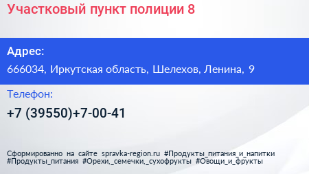 Участковый пункт полиции №8 по адресу 666034, Иркутская область, Шелехов, Ленина, 9 в дальнейшем Организация, размещена в следующих категориях: