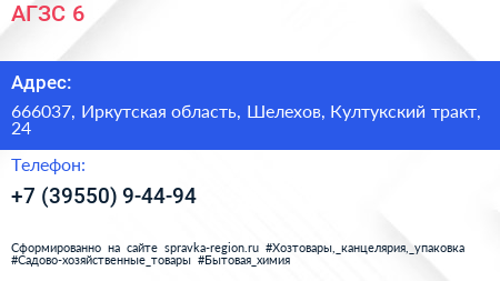 АГЗС №6 по адресу 666037, Иркутская область, Шелехов, Култукский тракт, 24 в дальнейшем Организация, размещена в следующих категориях: