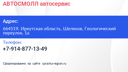 АВТОСМОЛЛ, автосервис по адресу 664519, Иркутская область, Шелехов, Геологический переулок, 1а в дальнейшем Организация, размещена в следующих категориях: