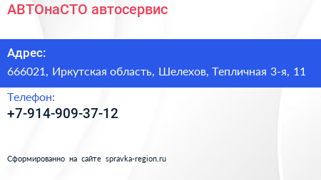 АВТОнаСТО, автосервис по адресу 666021, Иркутская область, Шелехов, Тепличная 3-я, 11 в дальнейшем Организация, размещена в следующих категориях: