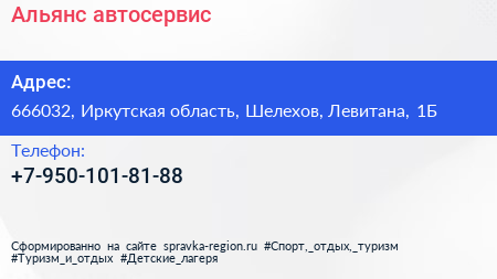 Альянс, автосервис по адресу 666032, Иркутская область, Шелехов, Левитана, 1Б в дальнейшем Организация, размещена в следующих категориях: