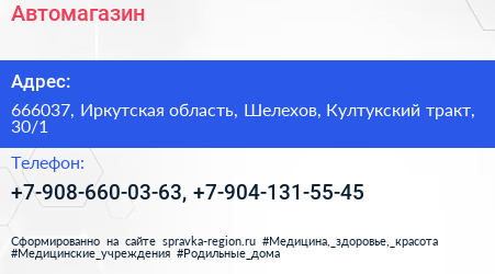 Автомагазин по адресу 666037, Иркутская область, Шелехов, Култукский тракт, 30/1 в дальнейшем Организация, размещена в следующих категориях: