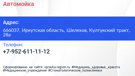 Автомойка по адресу 666037, Иркутская область, Шелехов, Култукский тракт, 28а в дальнейшем Организация, размещена в следующих категориях: