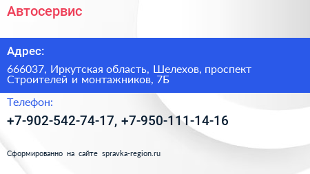Автосервис по адресу 666037, Иркутская область, Шелехов, проспект Строителей и монтажников, 7Б в дальнейшем Организация, размещена в следующих категориях: