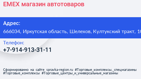 EMEX, магазин автотоваров по адресу 666034, Иркутская область, Шелехов, Култукский тракт, 10 в дальнейшем Организация, размещена в следующих категориях: