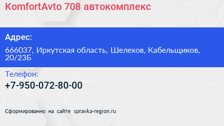 KomfortAvto 708, автокомплекс по адресу 666037, Иркутская область, Шелехов, Кабельщиков, 20/23Б в дальнейшем Организация, размещена в следующих категориях: